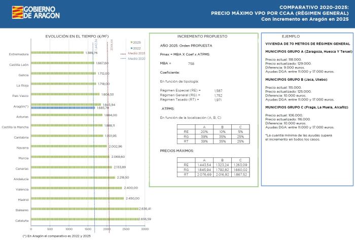 El resultado de esta modificación será la actualización del precio máximo en la compraventa de una vivienda protegida en un 9,5%, situándose en los 1.845,94 euros para una vivienda de régimen general en las capitales de provincia, con lo que el metro cuadrado podría experimentar una subida de hasta 160 euros para este caso. Dicho incremento se verá notablemente paliado por las ayudas de hasta 17.000 euros que concede el Gobierno de Aragón y que están contempladas en el Programa Compra Tu Vivienda del Plan Aragón Más Vivienda 2024-2030. “La disyuntiva a la que nos enfrentábamos no era la de subir o no subir el precio máximo de la VPA, la cuestión era quedarnos sin vivienda protegida, porque al precio al que estaba a los promotores ya no les interesaba construirla, o actualizar el precio e impulsar e incrementar el número de este tipo de viviendas más asequible que la del mercado libre y compensar la subida con las ayudas del Gobierno de Aragón a los compradores”, ha señalado Octavio López. “Entre una opción o la otra, creo que hemos elegido la adecuada”, ha apostillado el consejero.