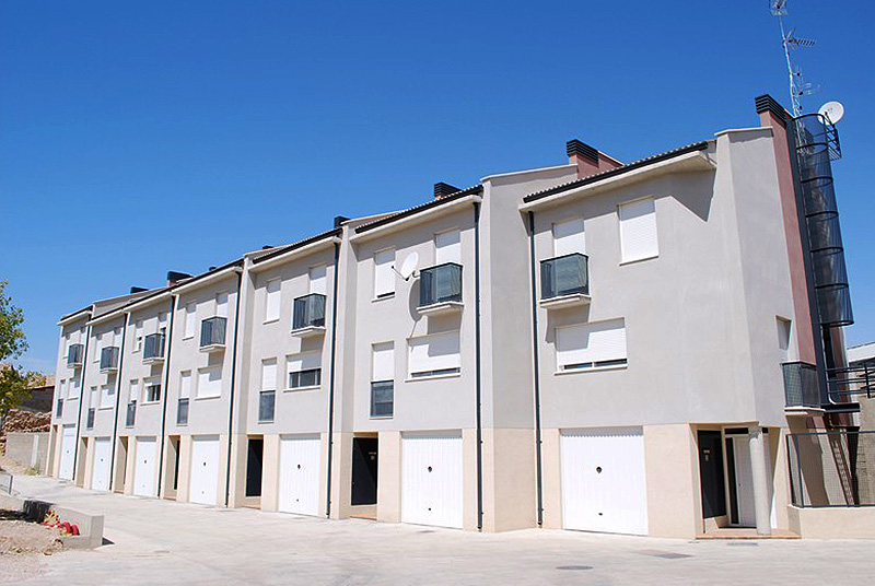 Doce viviendas unifamiliares divididas en dos bloques, con una zona ajardinada común.